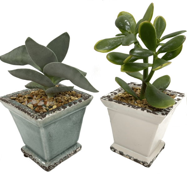 We feature a beautiful finished look to our succulent arrangements. They include a layer of glued decorative gravel and semi-precious gem stones added for a splash of color. We use a non-toxic, water soluble glue. As the plant is watered the glue slowly dissipates and the gravel will loosen. This makes it easy to transplant the succulent when the time comes. The glued gravel makes the arrangements easy to handle and keeps them from spilling and making a mess. It also makes them easier to ship to you!Additional information